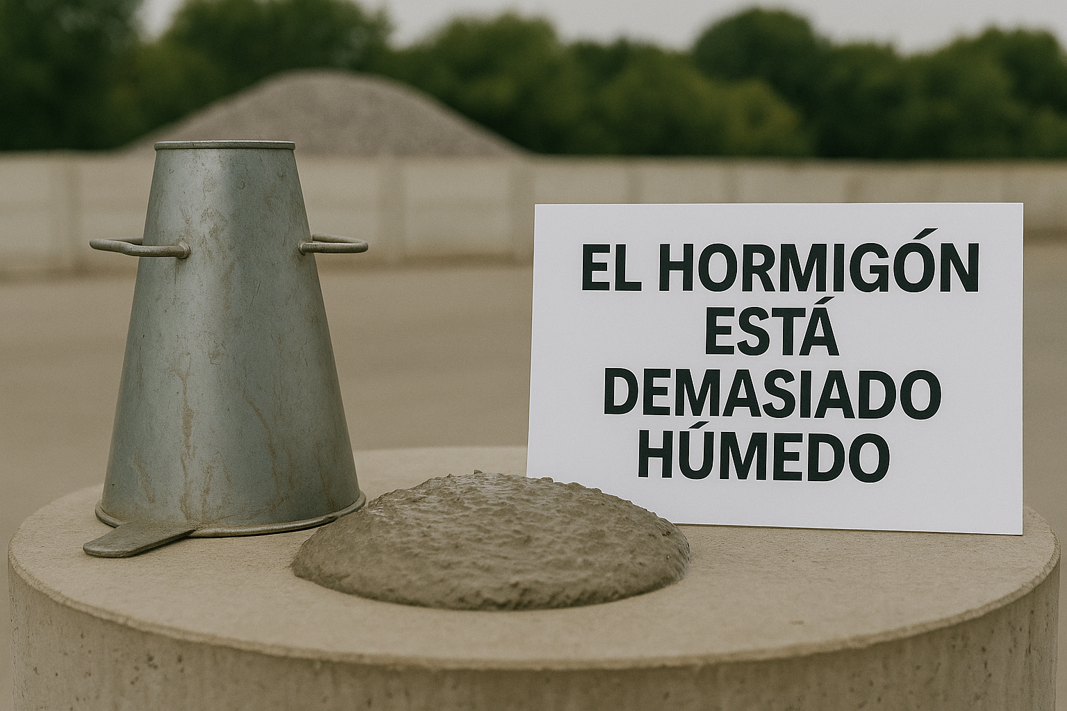 1. Prueba de asentamiento (cono de Abrams): Es la más estandarizada y proporciona una medida objetiva. Un asentamiento excesivo (más de 2 cm por encima del especificado) es una señal clara de exceso de agua.
